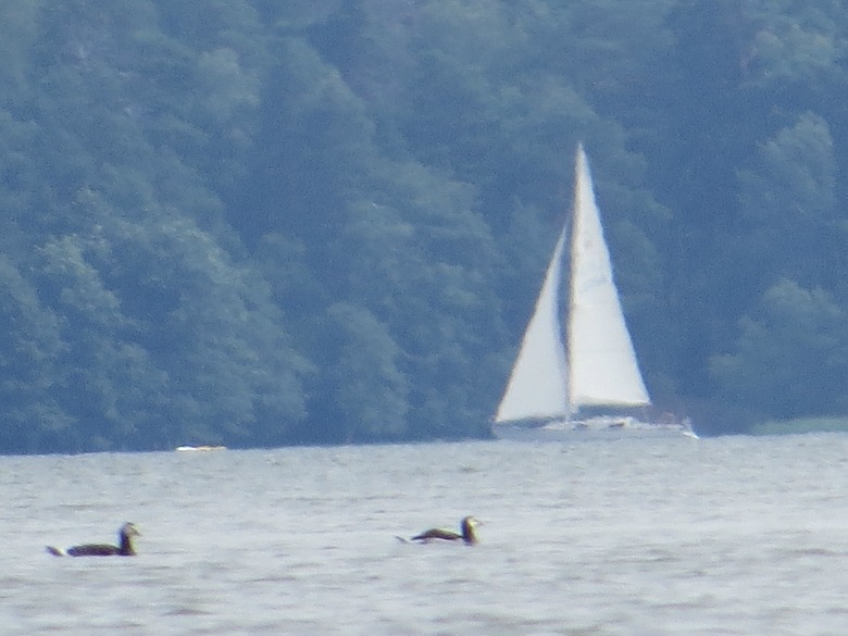 Sitten katsoin telepäästä otettua kuvaa ja huomasin, että siinä näkyy vasemmassa reunassa taustalla samoja puita, mitkä ovat näkyvissä myös laajakulmaisemmassa kuvassa. Niiden puiden perusteella koitin sovitella kuvia yhteen saadakseni tietää kuinka paljon vene on liikkunut -ja tulin siihen tulokseen, että purjevene on matkannut kuvien oton välillä jonkun aikaa vasemmalle päin ja tullut hiukan myös lähemmäs kuvaajaa, eli edennyt viistosti avoimemmille vesille päin, ehkä noin 30-50 metriä vasemmalle ja ehkä 10 metriä lähemmäs kuvaajaa? Taustalla olevasta pensaikosta ei ole mielestäni tullut zoomin avulla näkyviin enempää. Tällainen testi olisikin parempi tehdä jollain kiinteällä kohteella, vaikka jollain tolpalla tms.
